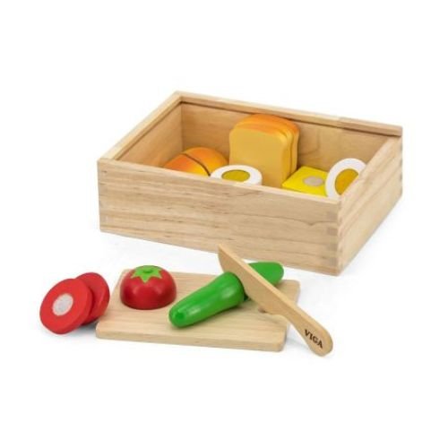 This well-finished wooden food playing set brings timeless fun.The set contains wooden breakfast food items (toast, egg, cheese, tomato, etc), a cutting board, and a knife. Cut food in half or several pieces, and fit them back together again with velcro.Packed a wooden box with an acrylic sliding lid for cleaning up and easy storage.