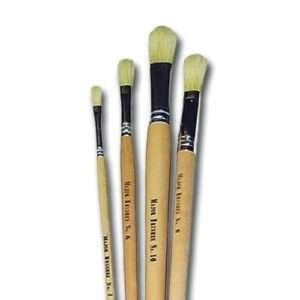 Hog Bristle Brushes with a flat tip and a long lacquered handle. The hair is firm and durable and suitable for use with most kinds of paints.