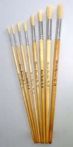 Hog Bristle Brushes with a round tip and a long lacquered handle. The hair is firm and durable and suitable for use with most kinds of paints.